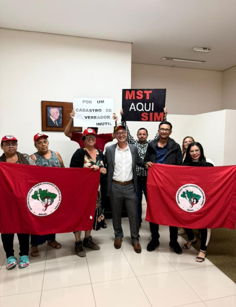 A reação foi imediata. Apoiadores do MST levantaram o cartaz “MST AQUI SIM” e responderam com vaias. Outro cartaz, “Por um cadastro de vereador inútil”, ironizou o projeto apresentado por Rafa Marques (PL), que propõe a criação de um cadastro municipal de “invasores de terra”.